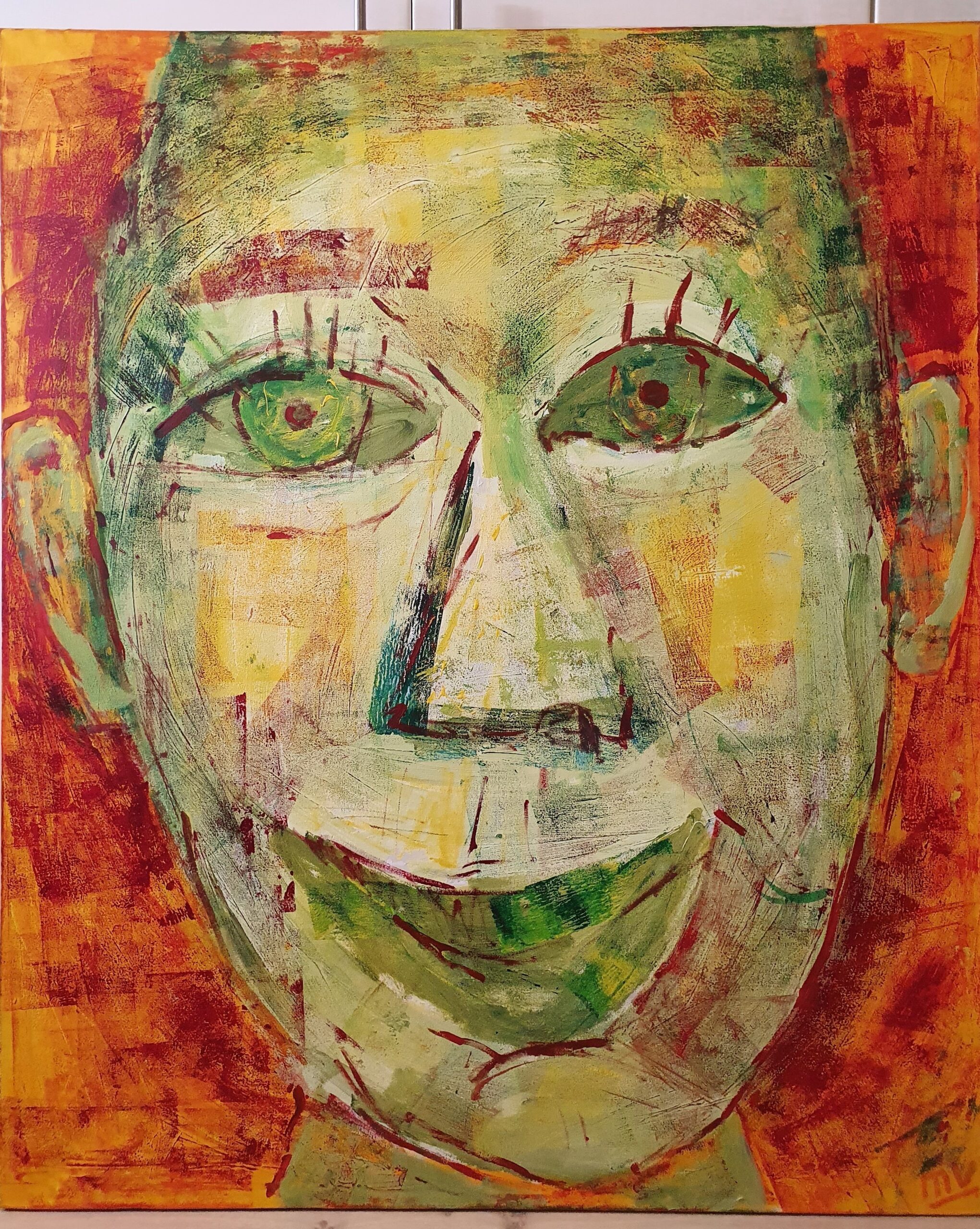 Een groot formaat schilderij waarbij een close-up van een vrolijk gezicht te zien is.
